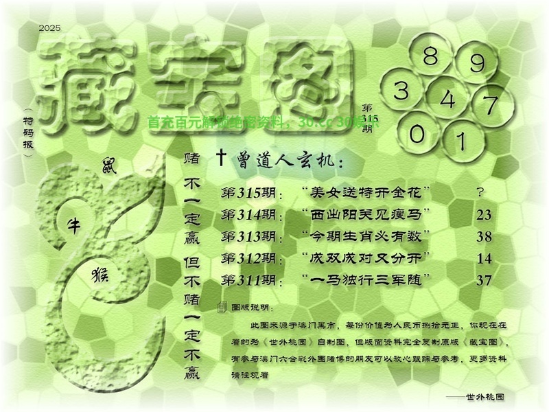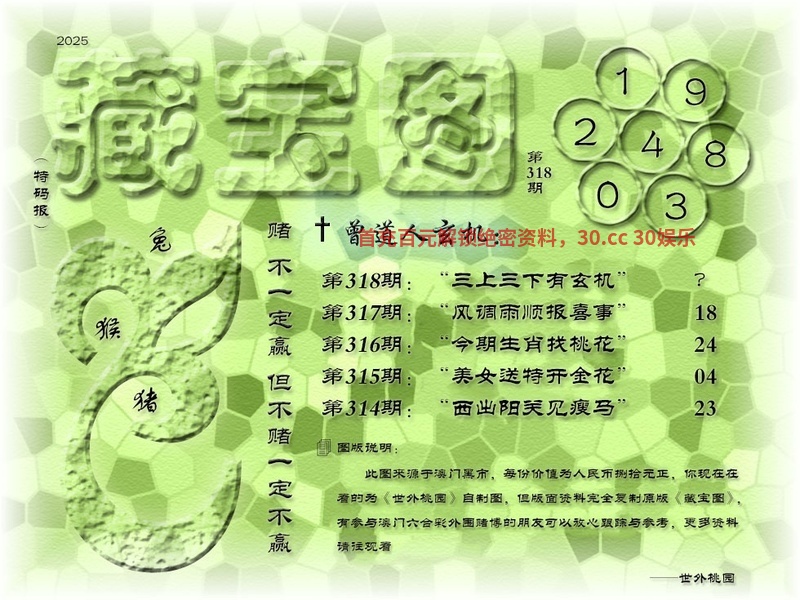 319期藏宝图曾道人玄机:更新 解:更新 解特肖:更新 |